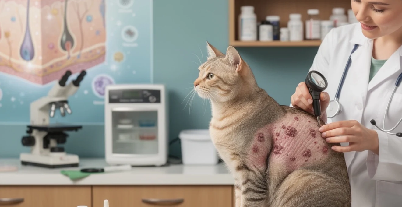 Face à un chat présentant des papules croûteuses évoquant une dermatite miliaire, le vétérinaire doit raisonner comme un enquêteur. De nombreux troubles cutanés peuvent imiter ce tableau clinique : pyodermite superficielle, pemphigus foliacé, complexe granulome éosinophilique, gale notoédrique, cheylétiellose, teigne, allergies multiples… Un examen clinique complet, associé à des examens complémentaires ciblés, permet de distinguer ces différentes hypothèses. L’objectif est double : confirmer qu’il s’agit bien d’une dermatite miliaire féline et, surtout, remonter jusqu’à la ou les causes sous-jacentes pour adapter le traitement.